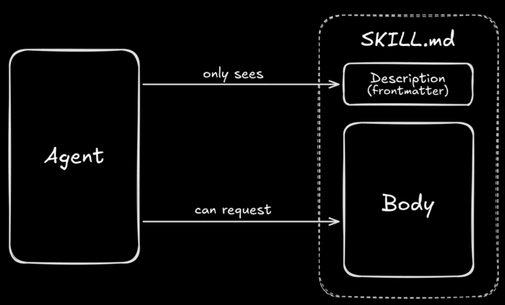 所谓渐进式披露与动态发现,是指 Agent 最初只能看到技能的描述(Frontmatter),但可以在需要时再请求加载技能正文,采用智能的三级系统: